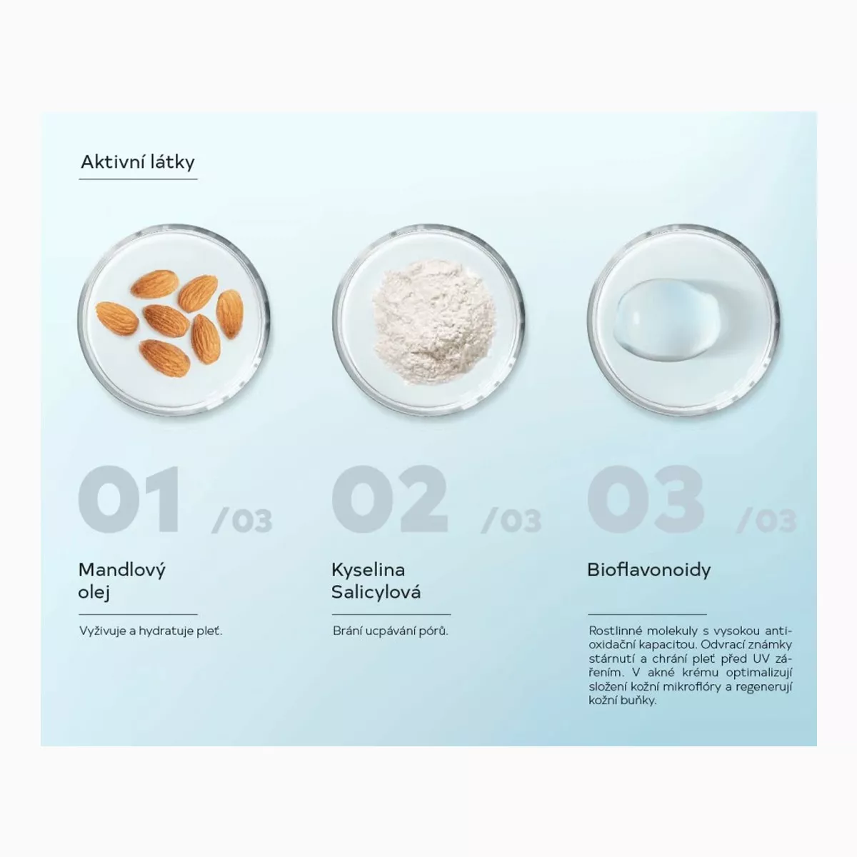 Krém poskytuje komplexní péči pokožce potýkající se s akné. Mandlový olej pleť vyživí – kromě hydratačního účinku jí dodá vitamíny a minerály. Pokožka tak zůstane hebčí a svěžejší. Směs přírodních látek a kyseliny salicylové sjednotí strukturu pokožky, zbaví ji nečistot usazených hluboko v pórech a zabrání tvorbě černých teček.